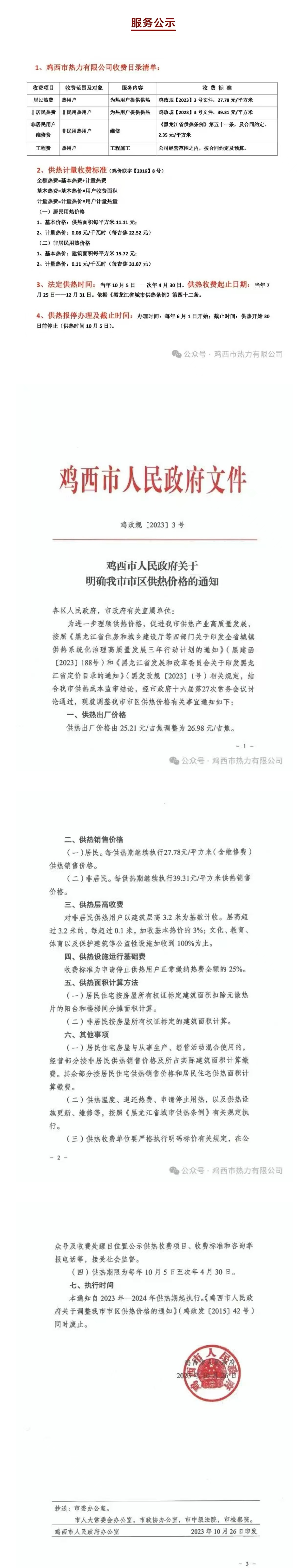 服務(wù)公示——附《雞西市人民政府關(guān)于明確我市市區(qū)供熱價(jià)格的通知》雞政規(guī)【2023】3號(hào)文件